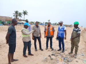 Premier arrêt : la plage de Nyékonakpoè. Sur ce site stratégique, où les eaux pluviales sont évacuées vers la mer, le ministre a pris le temps d’évaluer le fonctionnement de l’exutoire, un ouvrage clé pour éviter l’accumulation des eaux en ville.